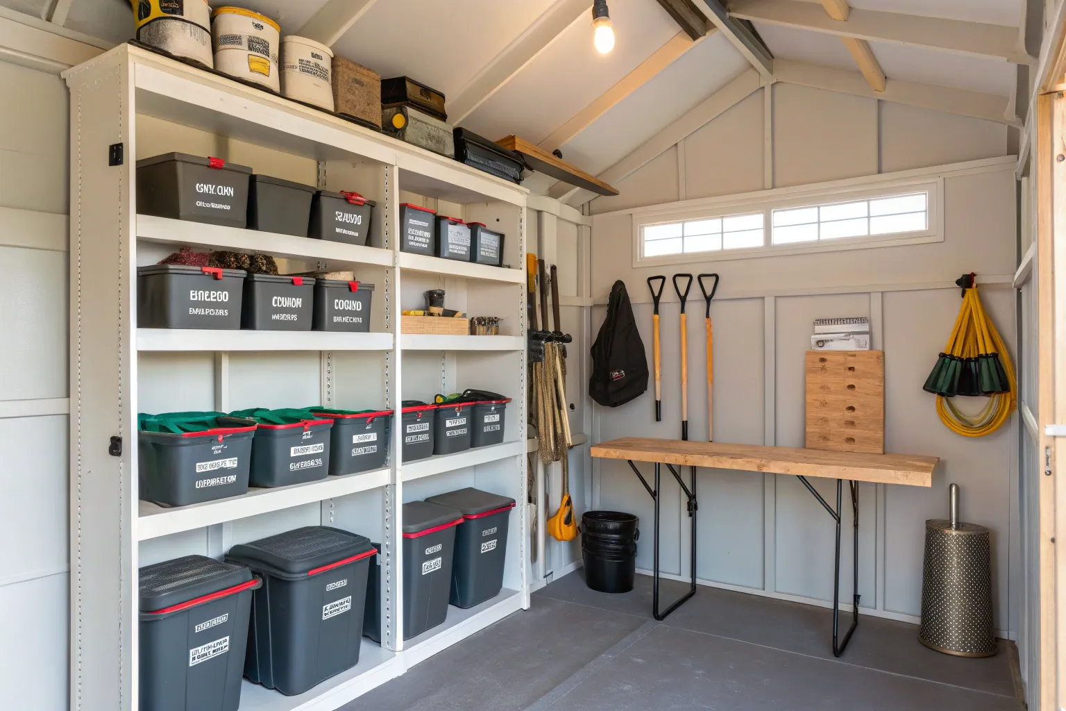 - Stackable Plastic Storage Containers: Maximize space with stackable containers. Perfect for keeping your shed tidy and accessible.