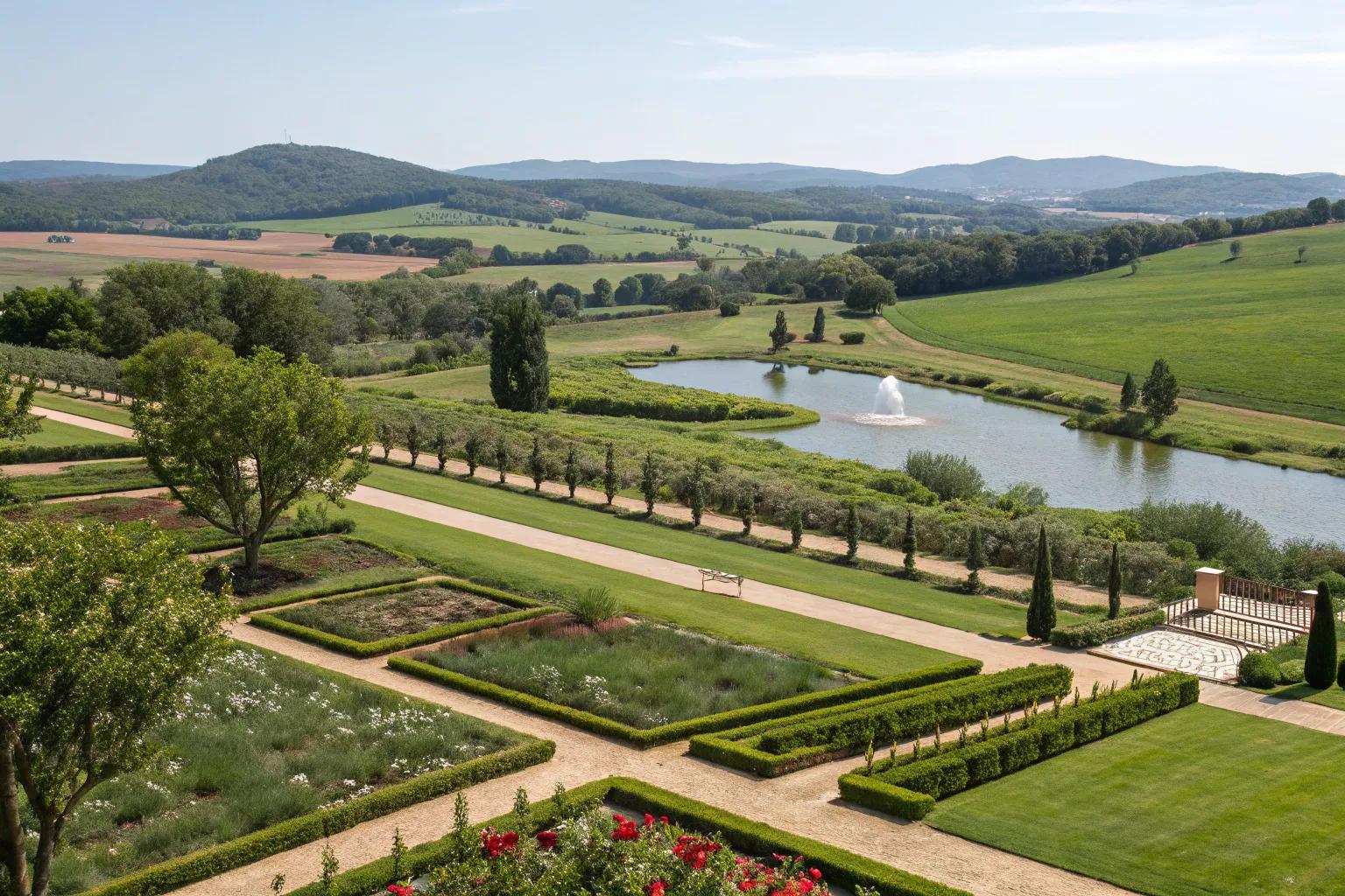 Add charm with ornamental elements like sculptures or decorative hedges. In my designs, these touches often become conversation pieces and set a unique tone for the garden.