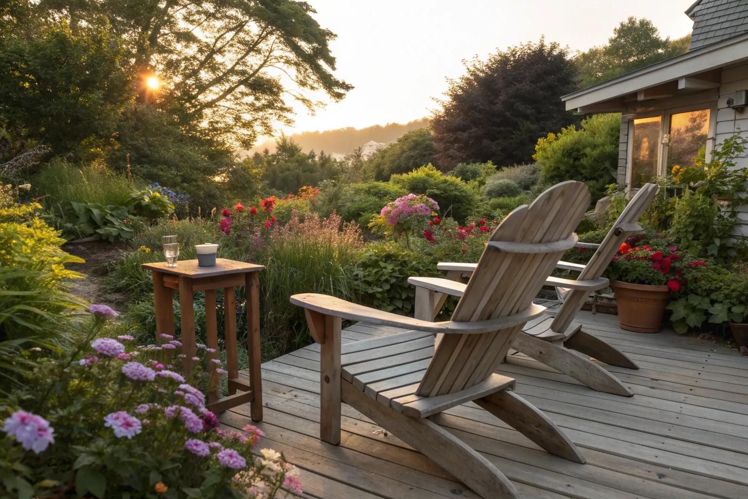 Create a twilight retreat with Adirondack chairs and soft lighting. I love how this setup turns ordinary evenings into magical experiences.
