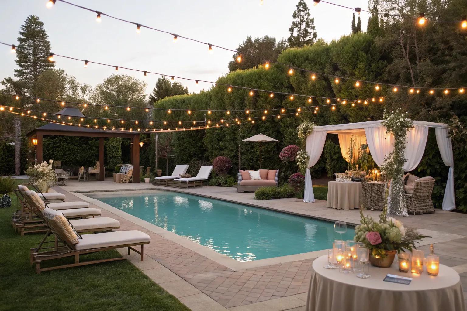 Turn your pool area into a vibrant tropical paradise with tiki torches, Hawaiian leis, and bright floral decorations. From my experience, the key is to serve tropical cocktails and fruit platters to really immerse your guests in the island vibe.