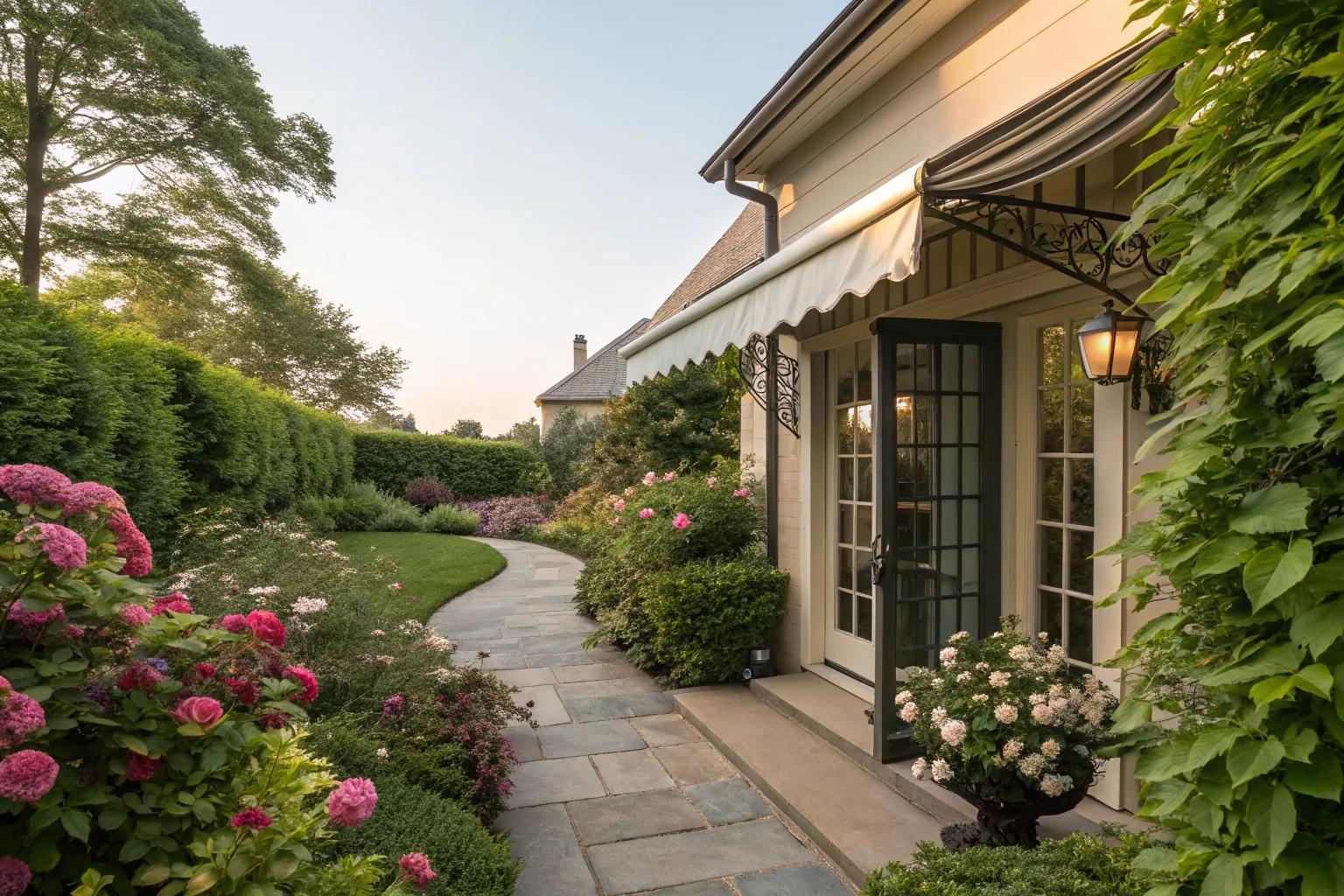There’s something timeless about a classic wooden awning with decorative brackets. I once helped a client pair it with climbing plants, creating a beautiful entrance that feels like stepping into a fairy tale.