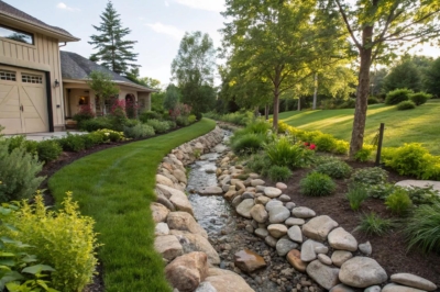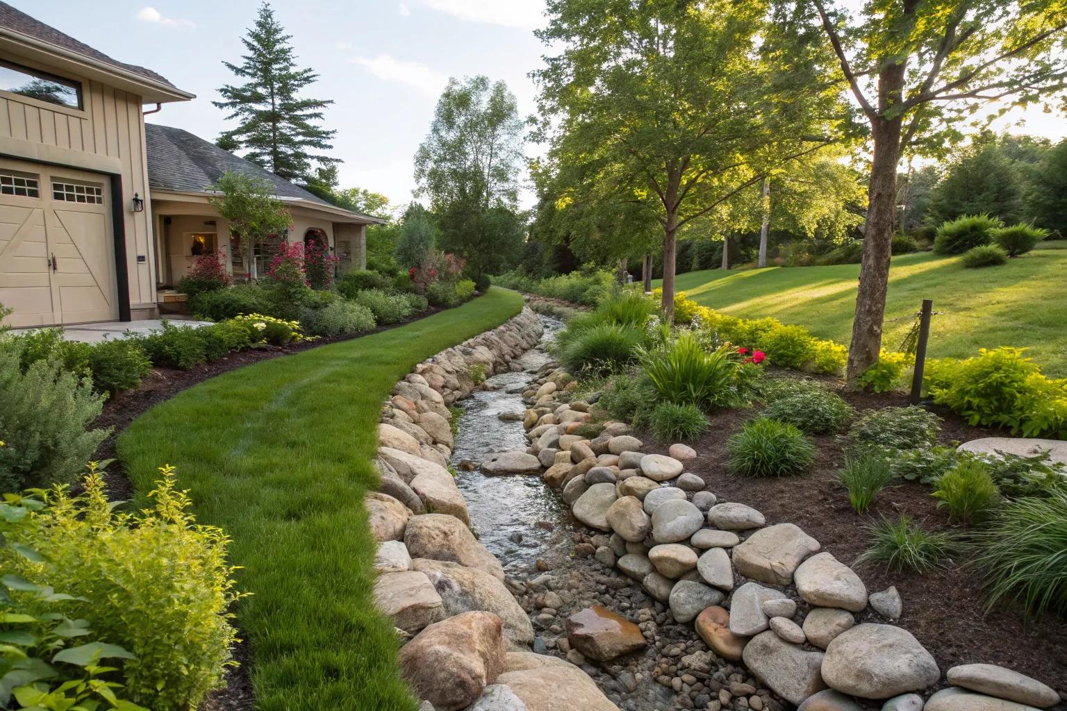 Transform your drainage ditch into a dry creek bed with smooth river rocks and strategically placed plants. I’ve found this approach not only manages water effectively but also adds a whimsical charm to the yard.
