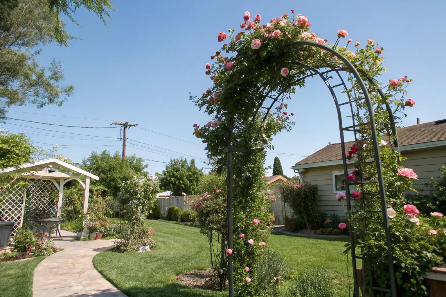 For a touch of elegance, opt for a wrought iron arch. They’re timeless and can support heavy climbers like wisteria, which I adore.
