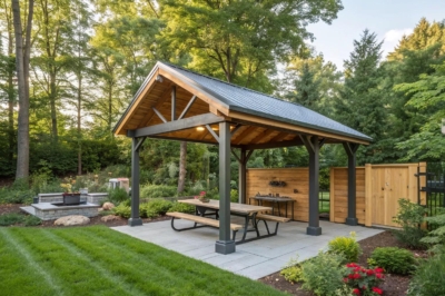 A wooden pavilion can create a rustic yet elegant vibe in your backyard. I once helped a client build one with cedar beams, and it became their favorite gathering spot.