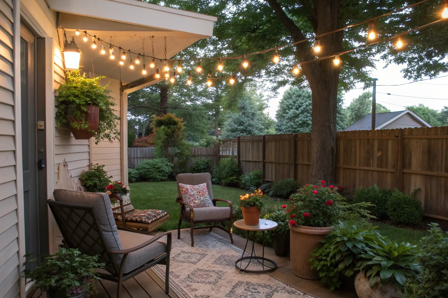 Incorporate wooden furniture and lush greenery to create a refreshing, natural atmosphere. I always recommend using a mix of planters and hanging baskets for a layered look.