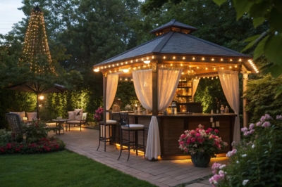 Set the mood with ambient lighting. String lights, lanterns, or LED strips can turn your gazebo into a magical evening retreat.