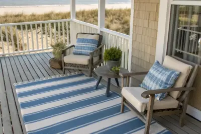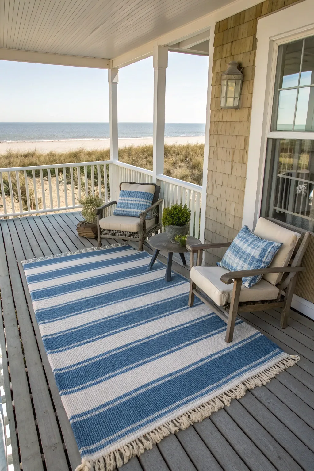 - Weather-Resistant Striped Rug: Enhance your outdoor space with a weather-resistant striped rug, ideal for beach house porches.