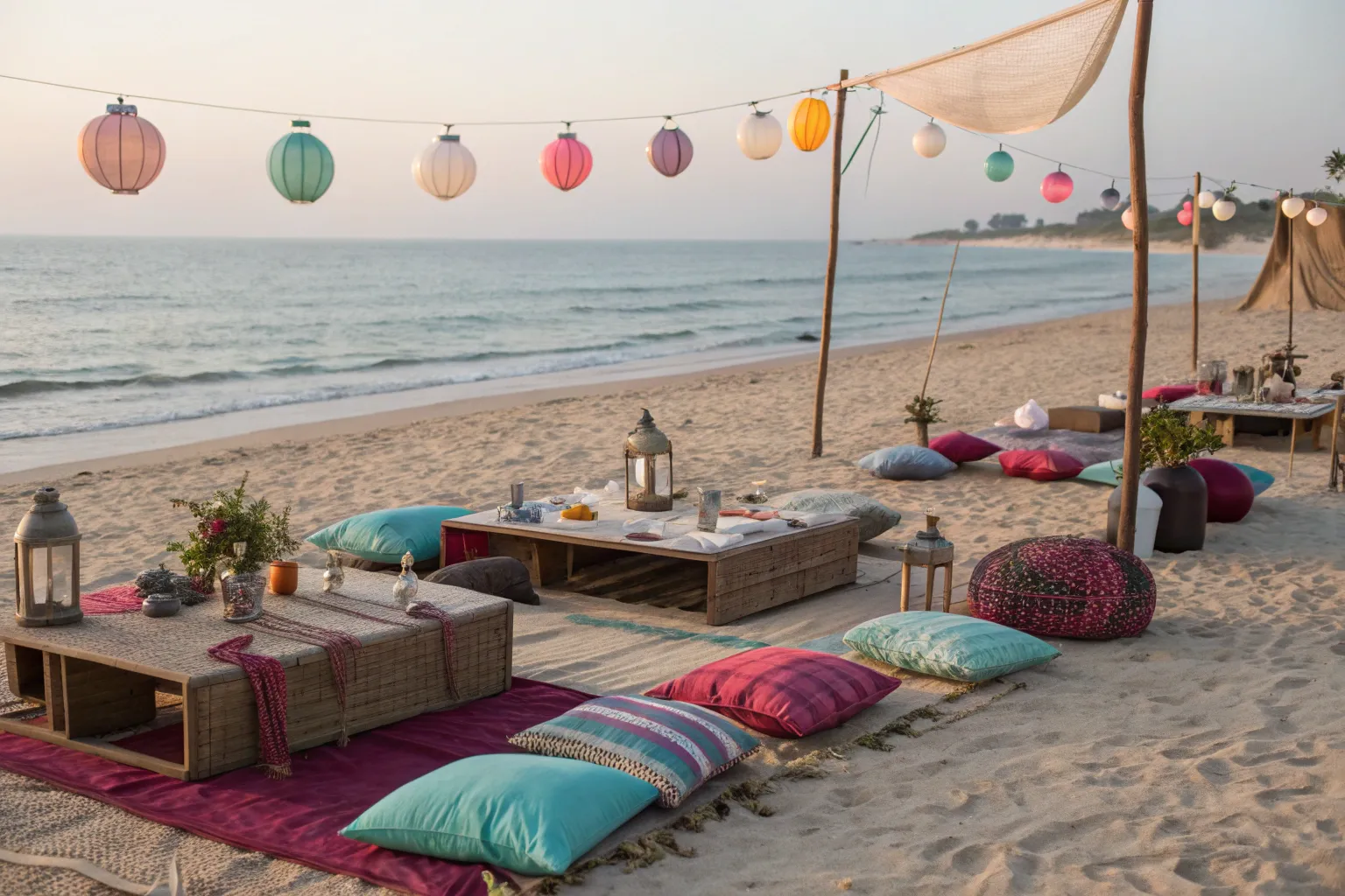 Setting up low tables can create an intimate dining atmosphere by the beach. I often suggest using wooden pallets for a rustic touch, paired with colorful table runners.