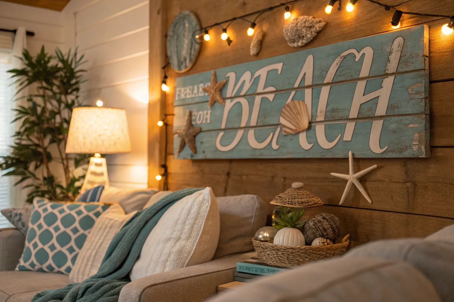 Use bright, tropical colors to make your beach sign pop. In one project, a splash of turquoise and coral turned a plain sign into a focal point of the room.