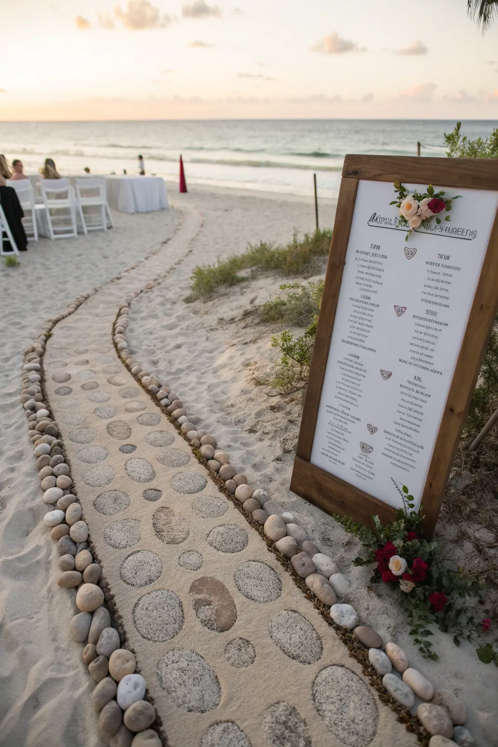 Create a pathway of pebbles leading to your seating chart for a tactile, earthy touch. This setup was a hit at a wedding I coordinated, inviting guests to explore.
