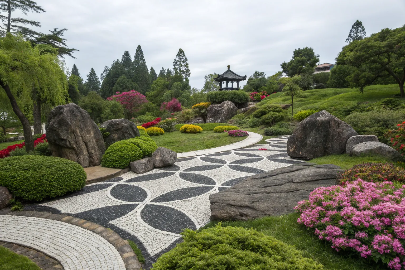 Curved Pathways with Black and White Stones