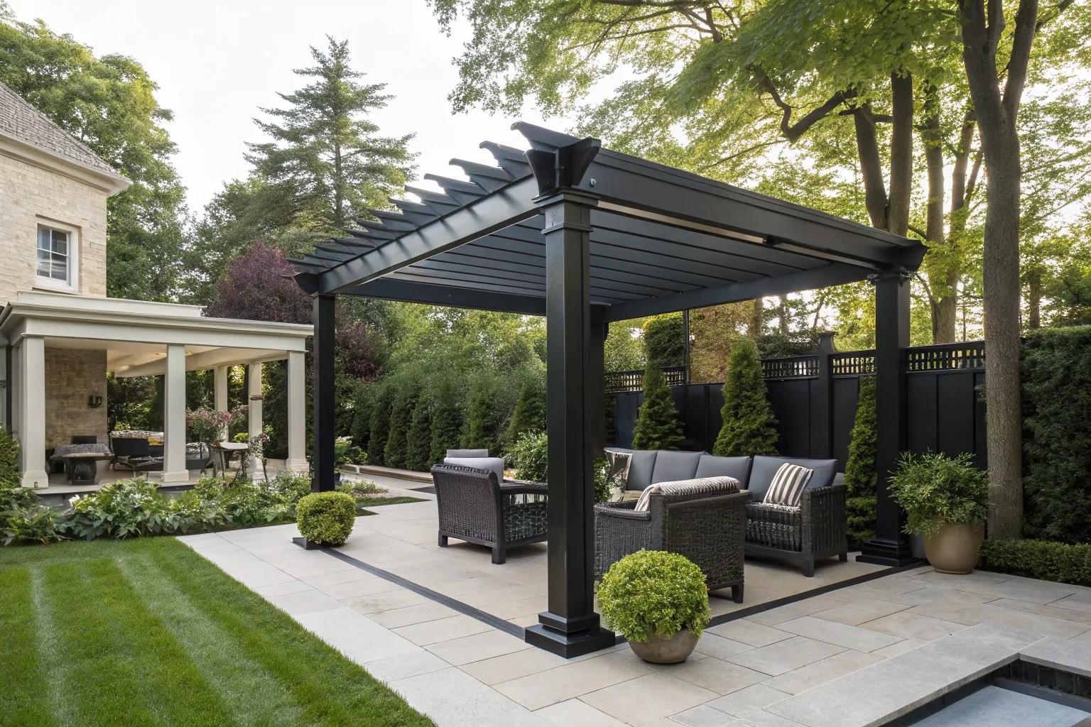 A modern minimalist black pergola can transform your outdoor space into a sleek oasis. I always recommend pairing it with neutral-toned furniture for a clean, contemporary look.
