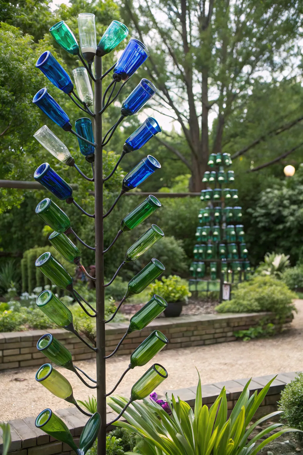 Create a modern art piece with a metal sculpture bottle tree. I once helped a client craft this design, and it became the centerpiece of their garden.