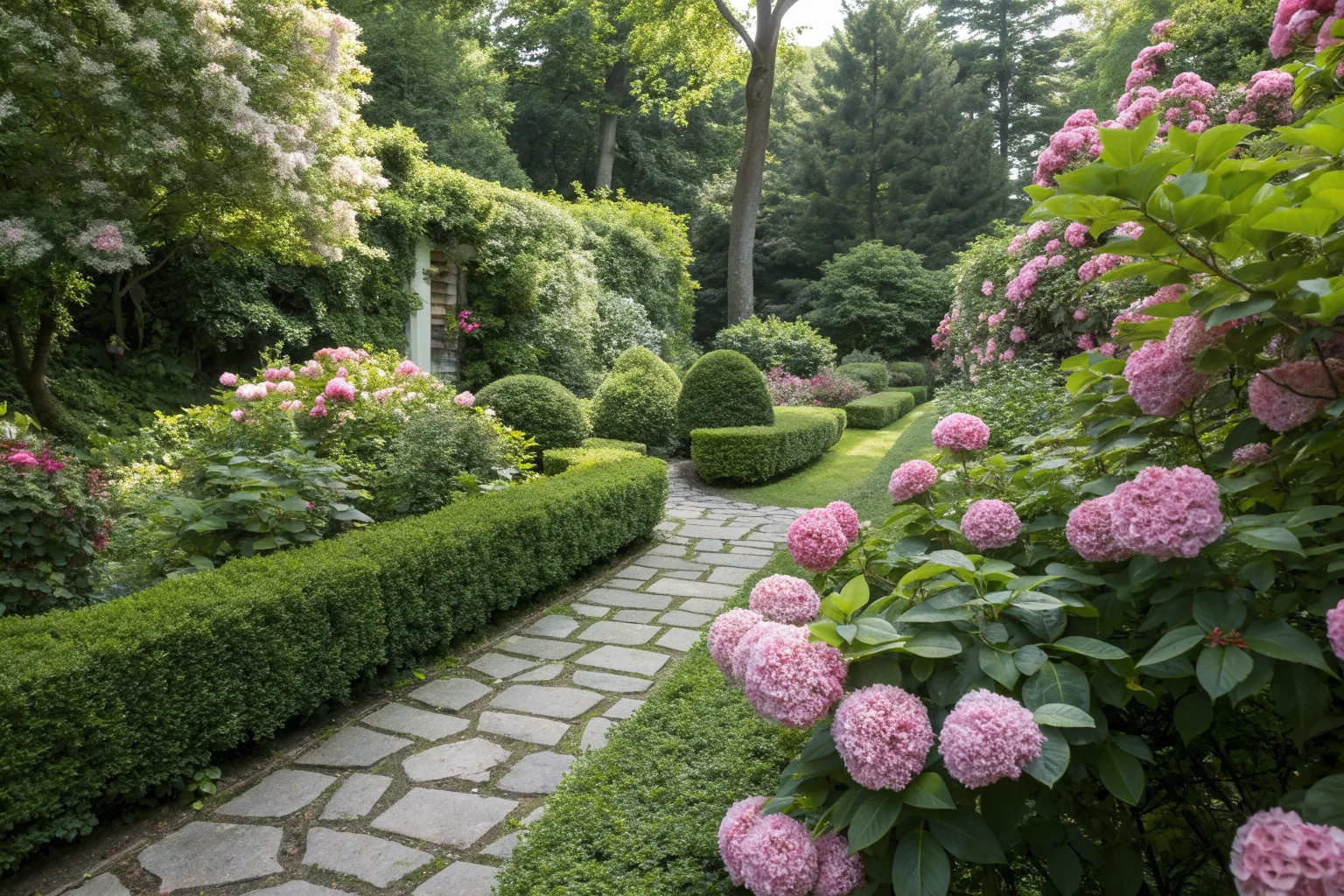 Use tall boxwood hedges for privacy, and add hydrangeas for a splash of color. This combo creates a secluded yet vibrant garden retreat.
