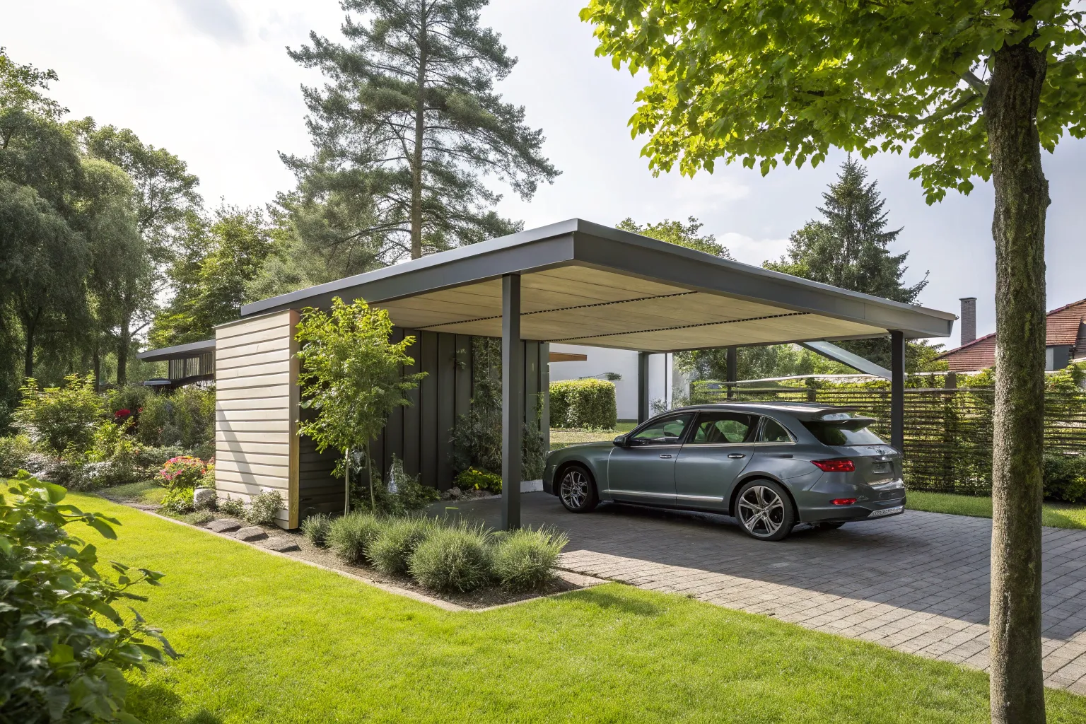 Consider a carport with a green roof to create a mini garden above. Not only does it look stunning, but it also helps with insulation and rainwater management.