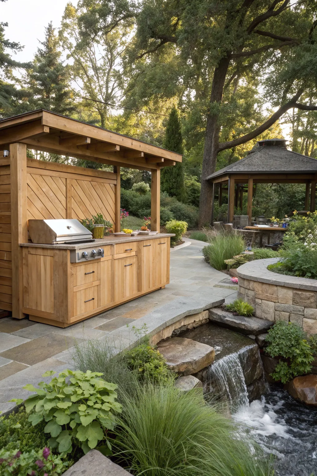 Position a water feature near your cedar kitchen for a soothing backdrop. The calming sound of water enhances the overall ambiance.