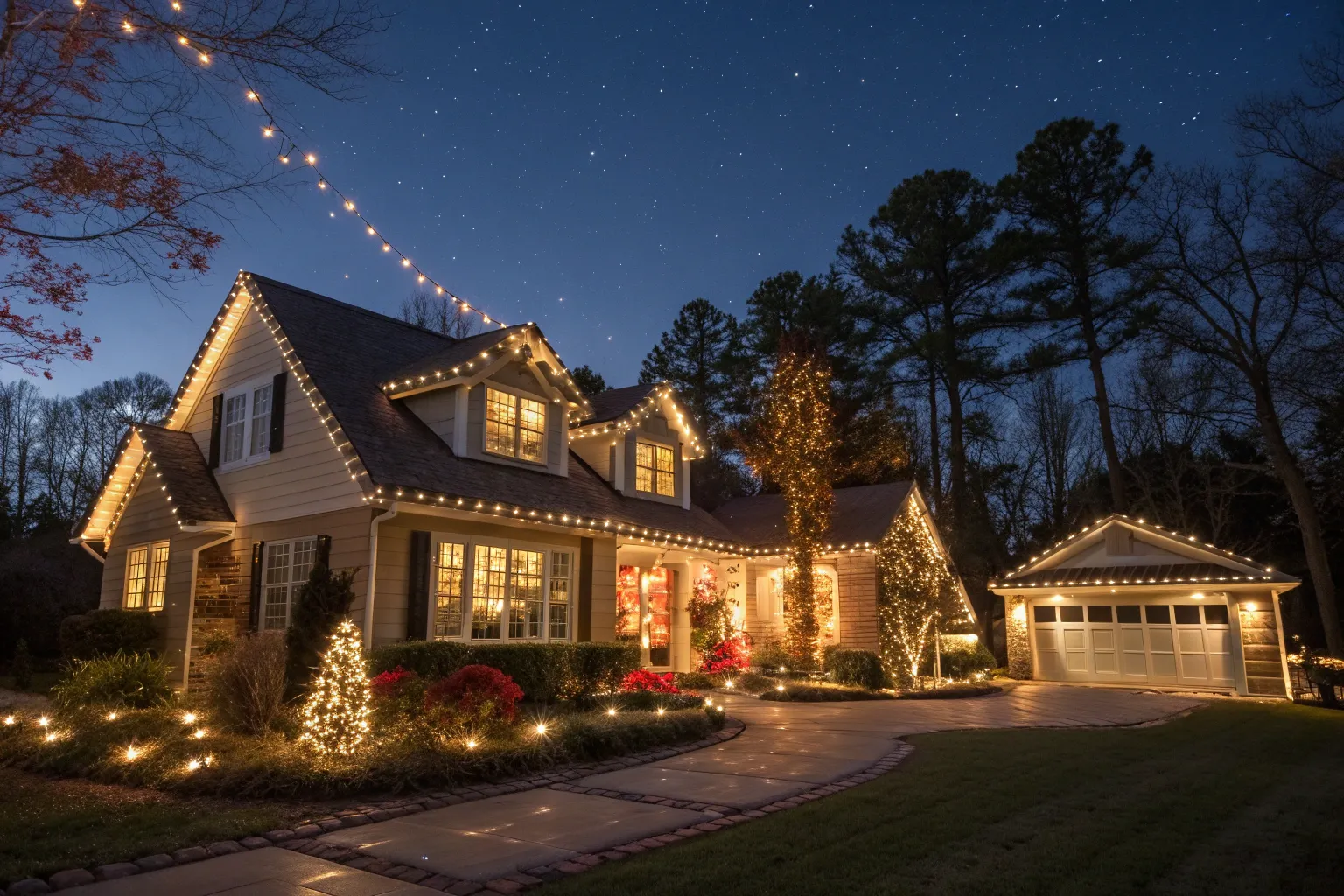 - Warm White LED String Lights: Illuminate your roofline with warm white LED string lights for a cozy, festive glow.