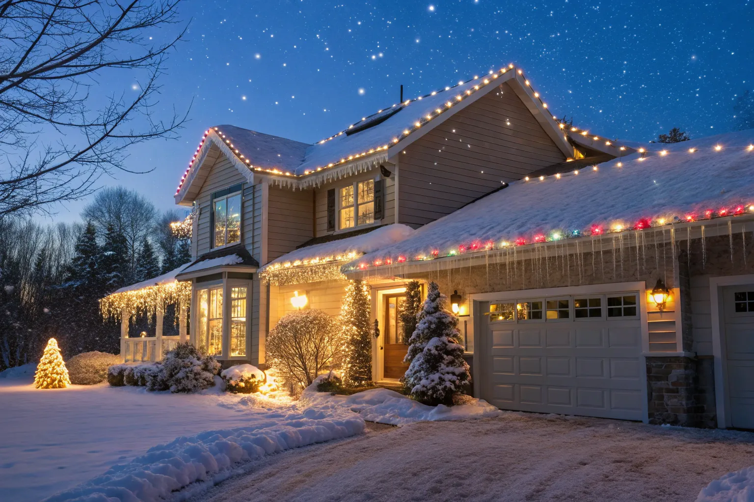 - Blue and White Icicle Lights: Enhance your roof’s edge with elegant blue and white icicle lights for a winter wonderland look.