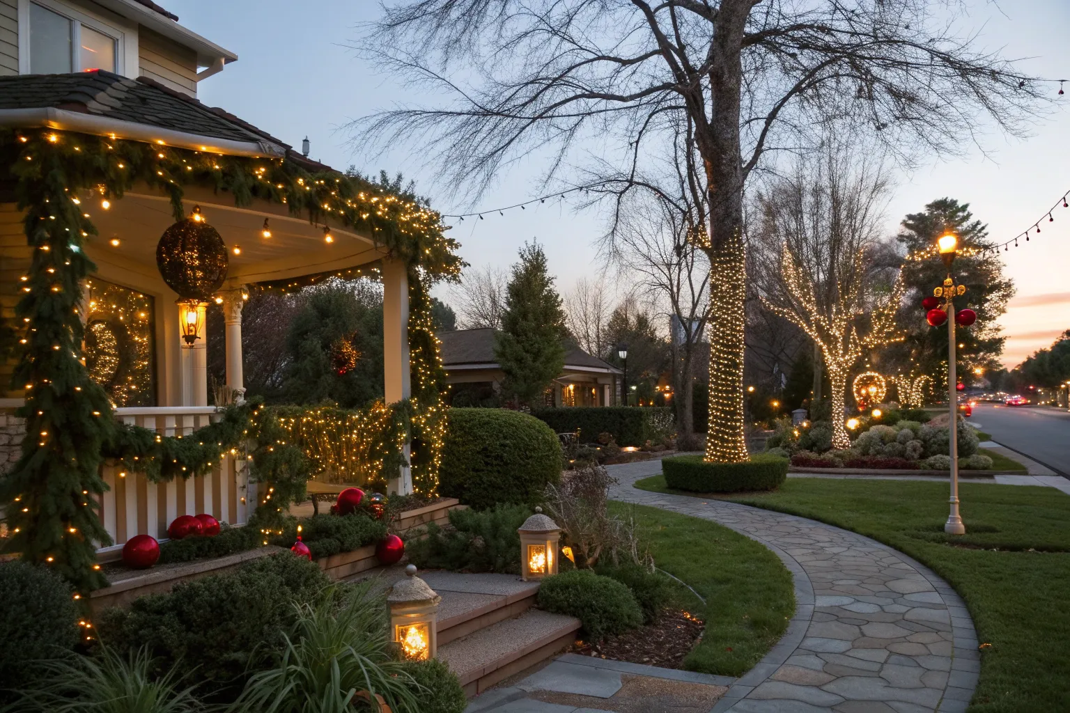 Adorn your doors and railings with wreaths and garlands embellished with bows and lights. This classic touch never fails to impress guests and neighbors alike.