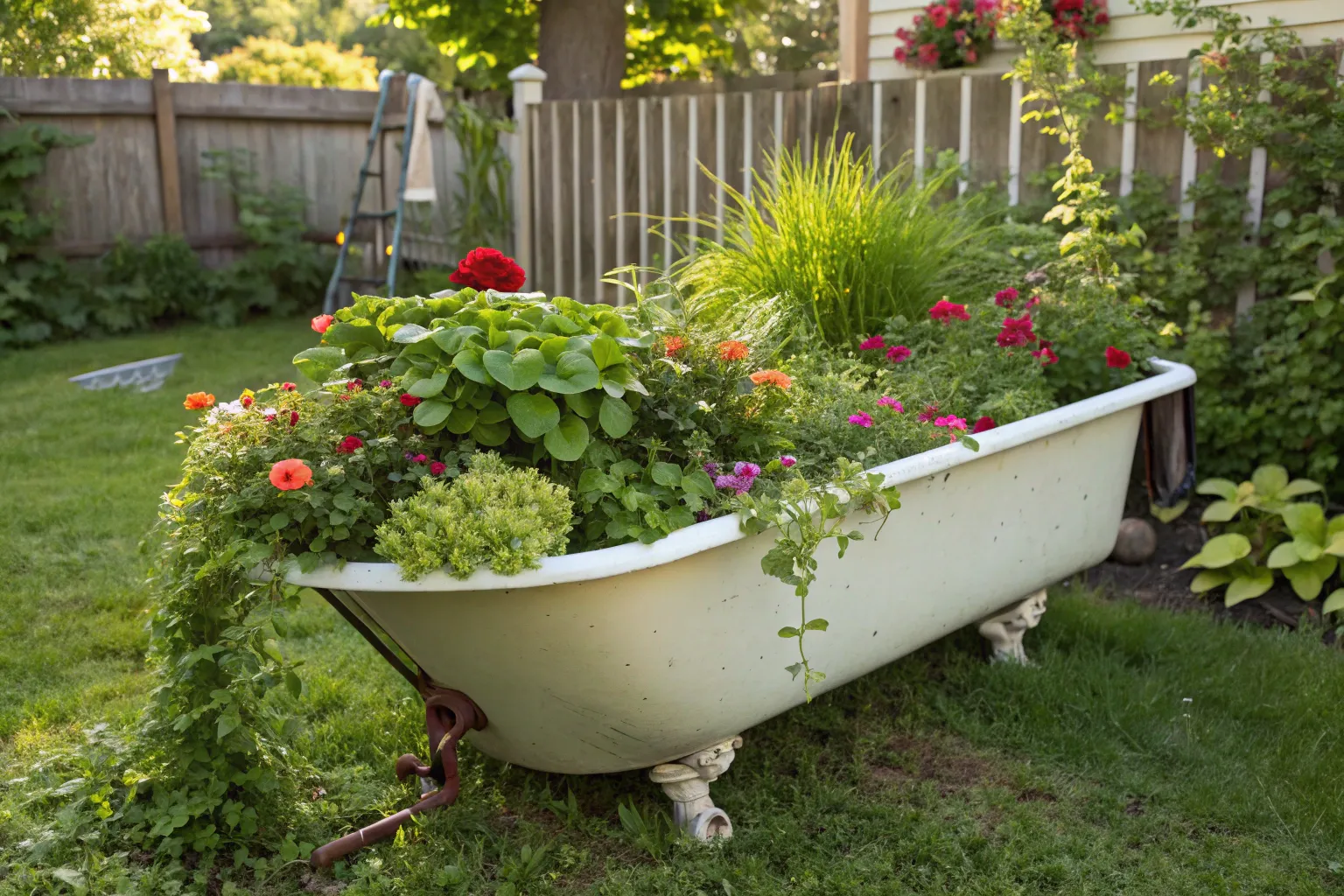 Imagine a cascade of colorful flowers spilling over the rim of your clawfoot tub. I helped a client create this stunning visual with petunias and nasturtiums, and it quickly became the star of her garden.