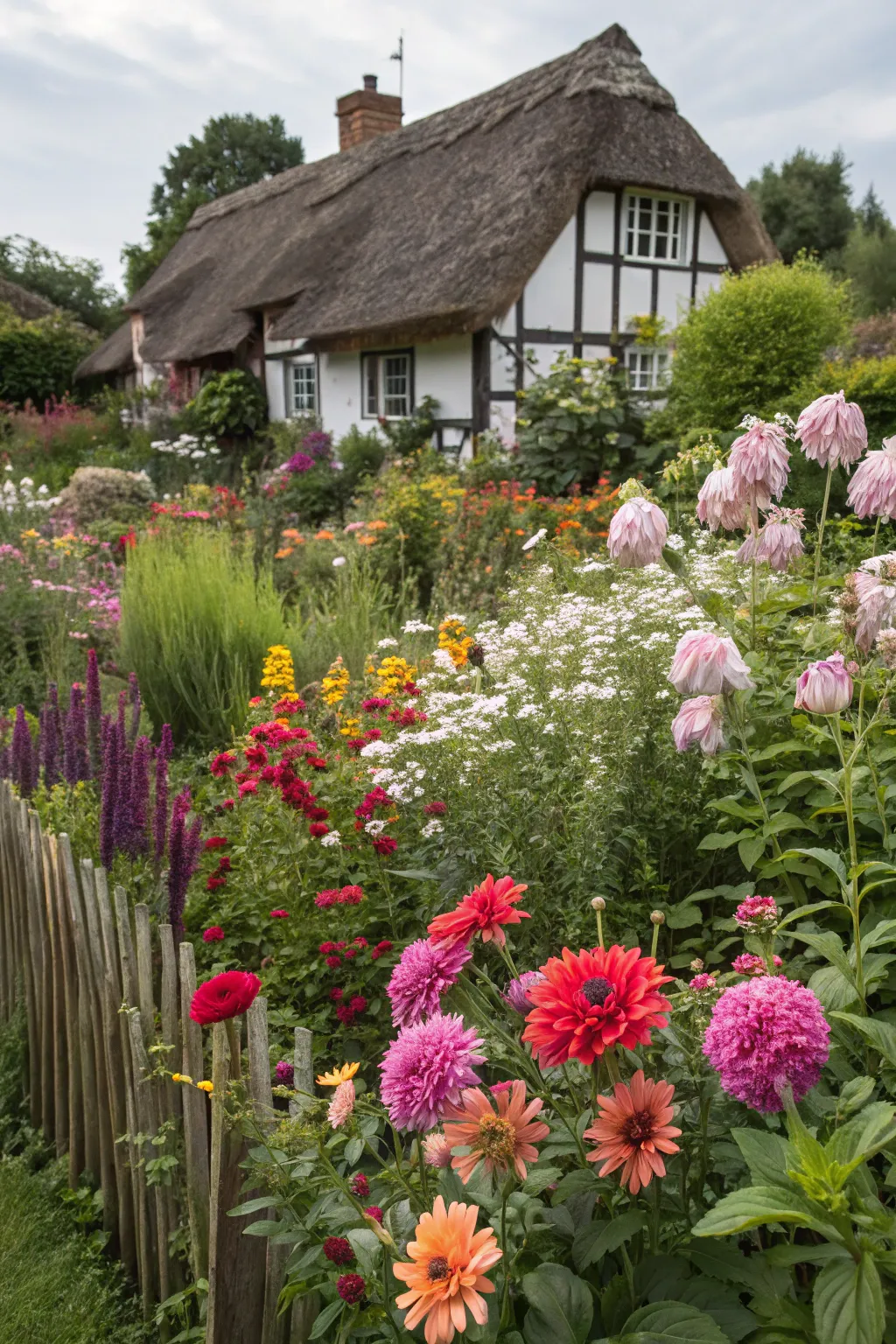 Let your garden burst with a variety of flowers like roses, foxgloves, and daisies. This lush, unrestrained look gives your garden that classic cottage charm I’ve seen work wonders for my clients.