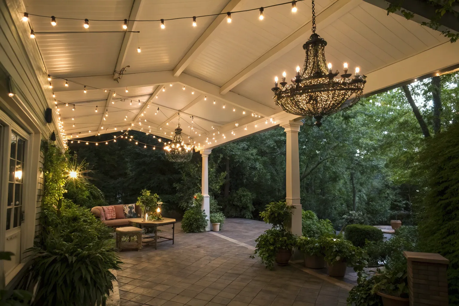 Create a magical atmosphere with fairy lights delicately strung across your patio. Clients often tell me they feel like they’re in an enchanted garden with this setup.