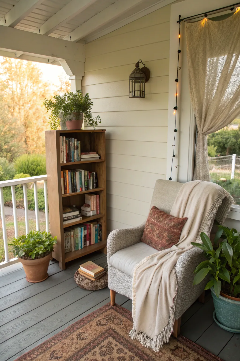 Setting up a small bookshelf invites relaxation with a good book. It’s a personal touch that makes your porch feel like an extension of your home.