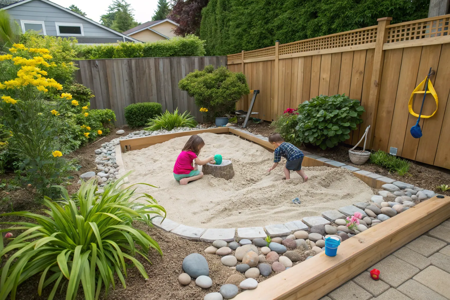 Consider adding built-in seating around your sand pit that doubles as a cover. I’ve seen this in a client’s yard, and it beautifully combines functionality with style, keeping the sand clean and the kids happy.