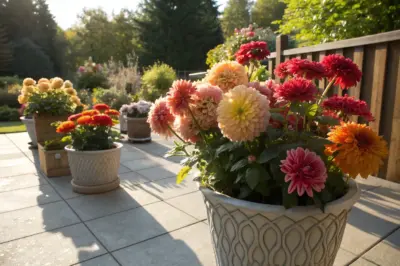 Don’t forget to look up! Hanging baskets filled with dahlias can transform a space, as I’ve seen in many garden projects.