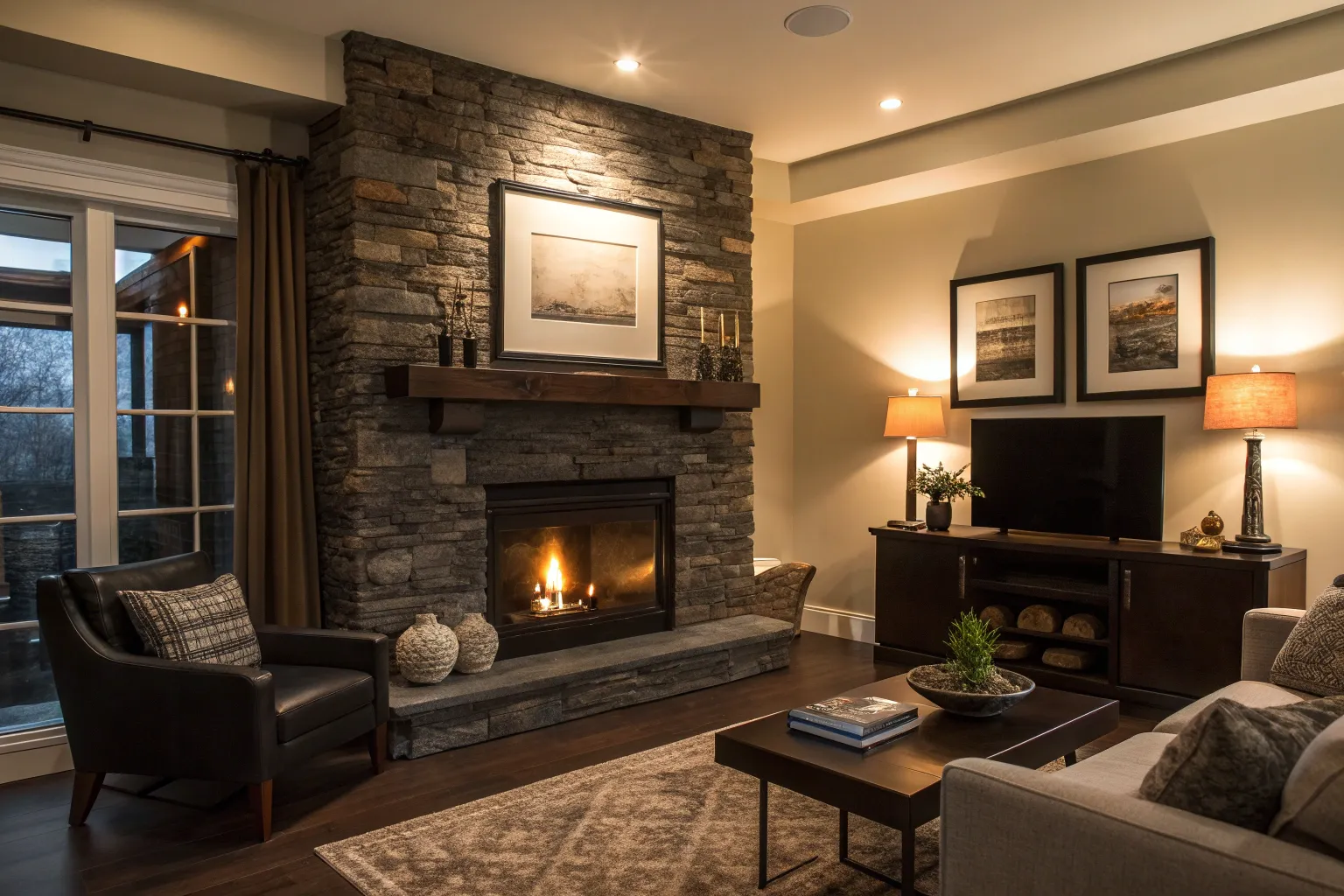 - Dark Stone Veneer Panels: Create a timeless look with dark stone veneer, adding texture and depth to your fireplace.