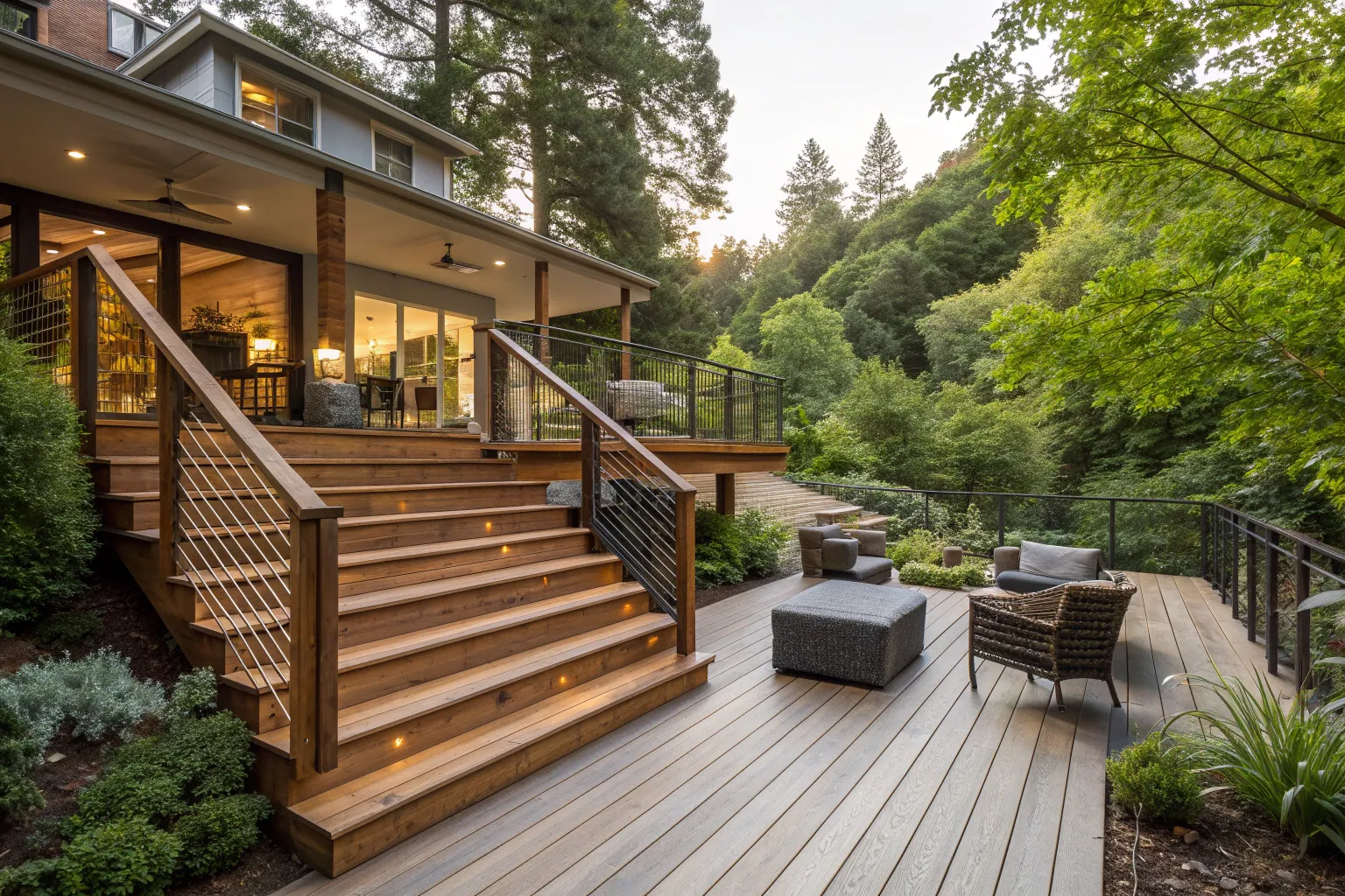 Add elegance with curved steps that soften the transition from deck to garden. I’ve seen this design beautifully complement both traditional and modern homes.