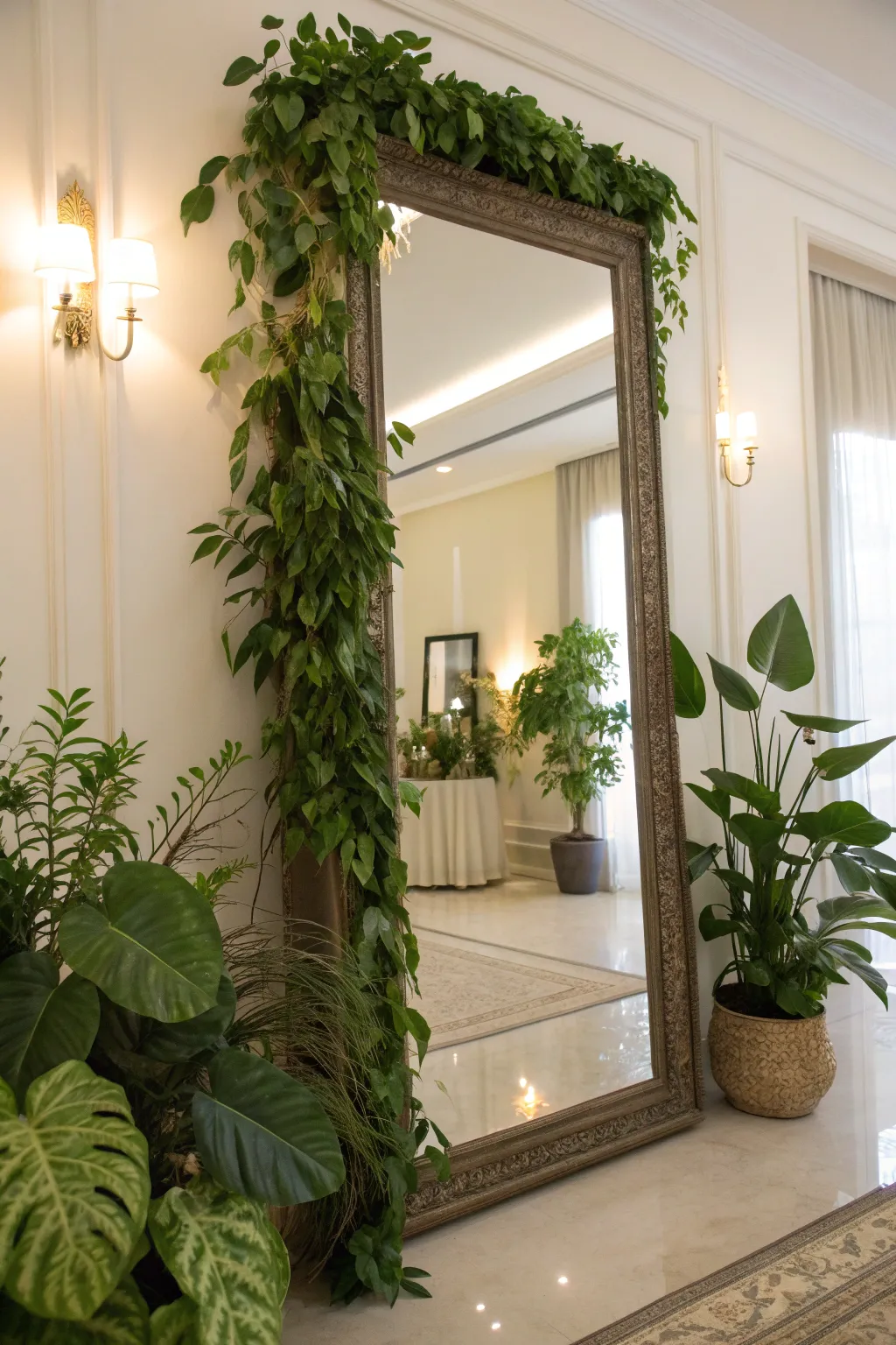 Enhance the reflective beauty of mirrors by framing them with leafy plants. This trick can make any space feel larger and more cohesive.