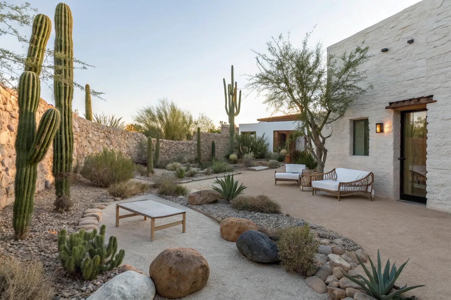 Using rocks, gravel, and sand can enhance your desert theme beautifully. These elements add texture and are a breeze to maintain, just like I’ve done in several client projects.