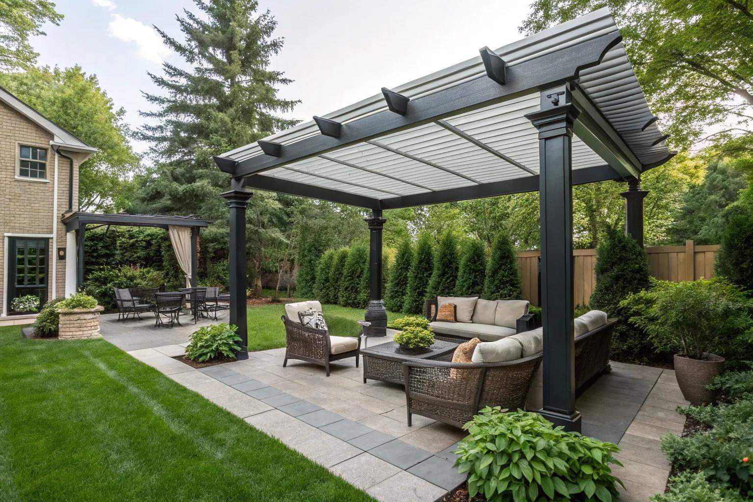 Create your own outdoor living room with plush sofas and armchairs under a stylish roof. It’s like bringing your favorite indoor comforts right into the garden, a setup I’ve seen work wonders for relaxing family evenings.