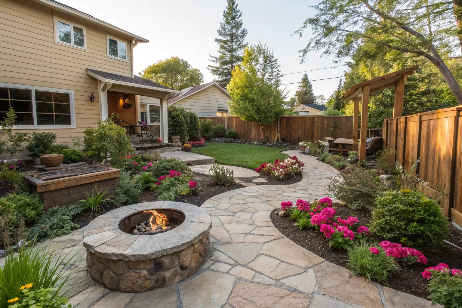 A fire pit is the perfect spot for gathering and making memories. I’ve helped clients create simple ones with just a few stone pavers and gravel, turning ordinary backyards into inviting retreats.