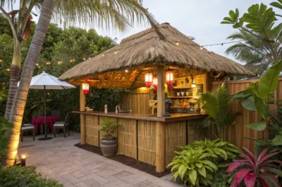 Using bamboo or rustic wood for your bar structure creates an authentic tiki feel. My clients love how these materials ages gracefully, adding character with time.