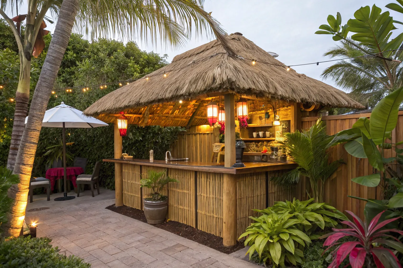 A thatched roof instantly transports you to a tropical getaway. I’ve found that using natural materials like raffia or synthetic alternatives can give you that lush, authentic look without breaking the bank.