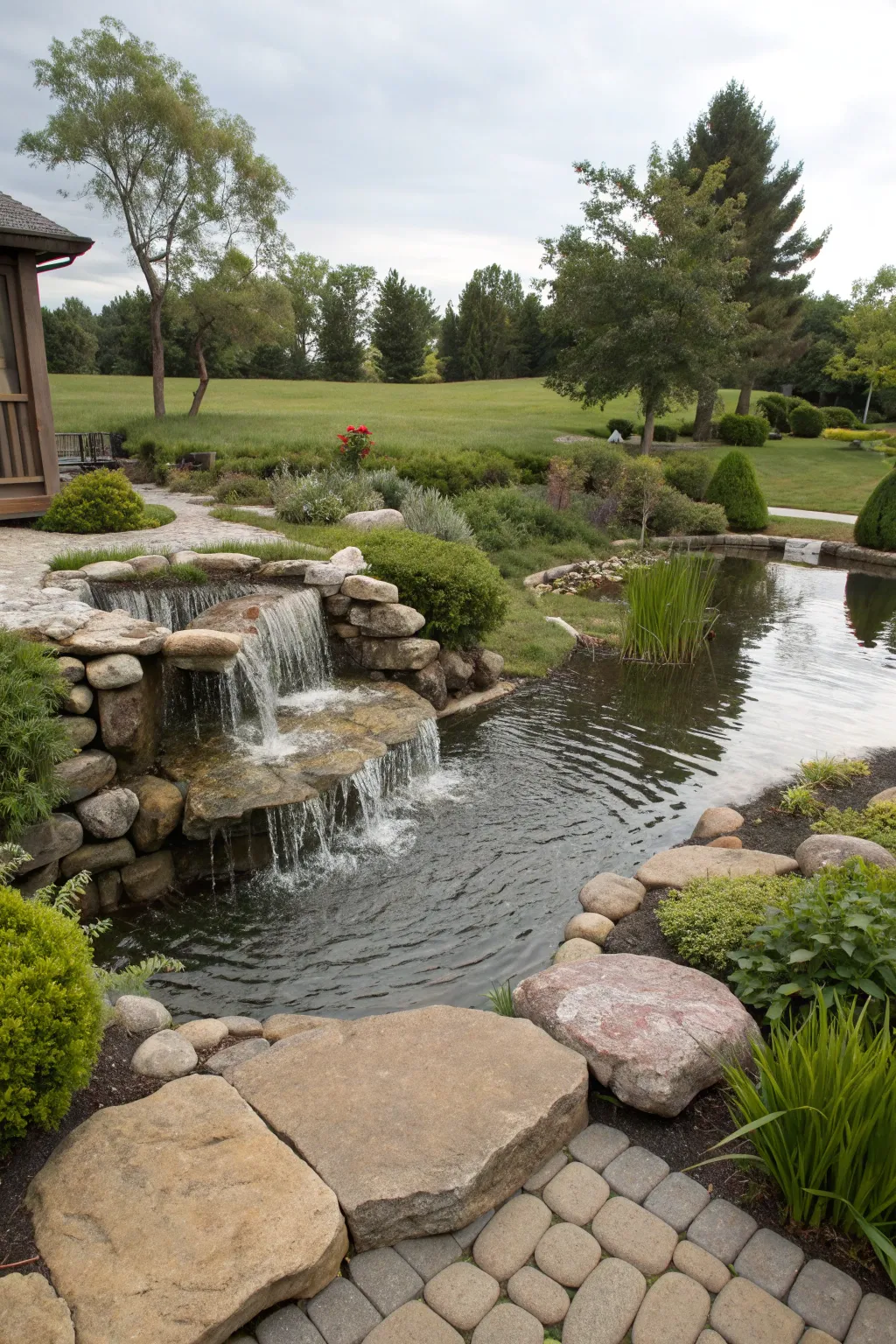 Use natural stone edging to define the pond’s perimeter, offering a rustic yet refined look. From my experience, this also acts as a barrier to keep dogs from trampling nearby plants.