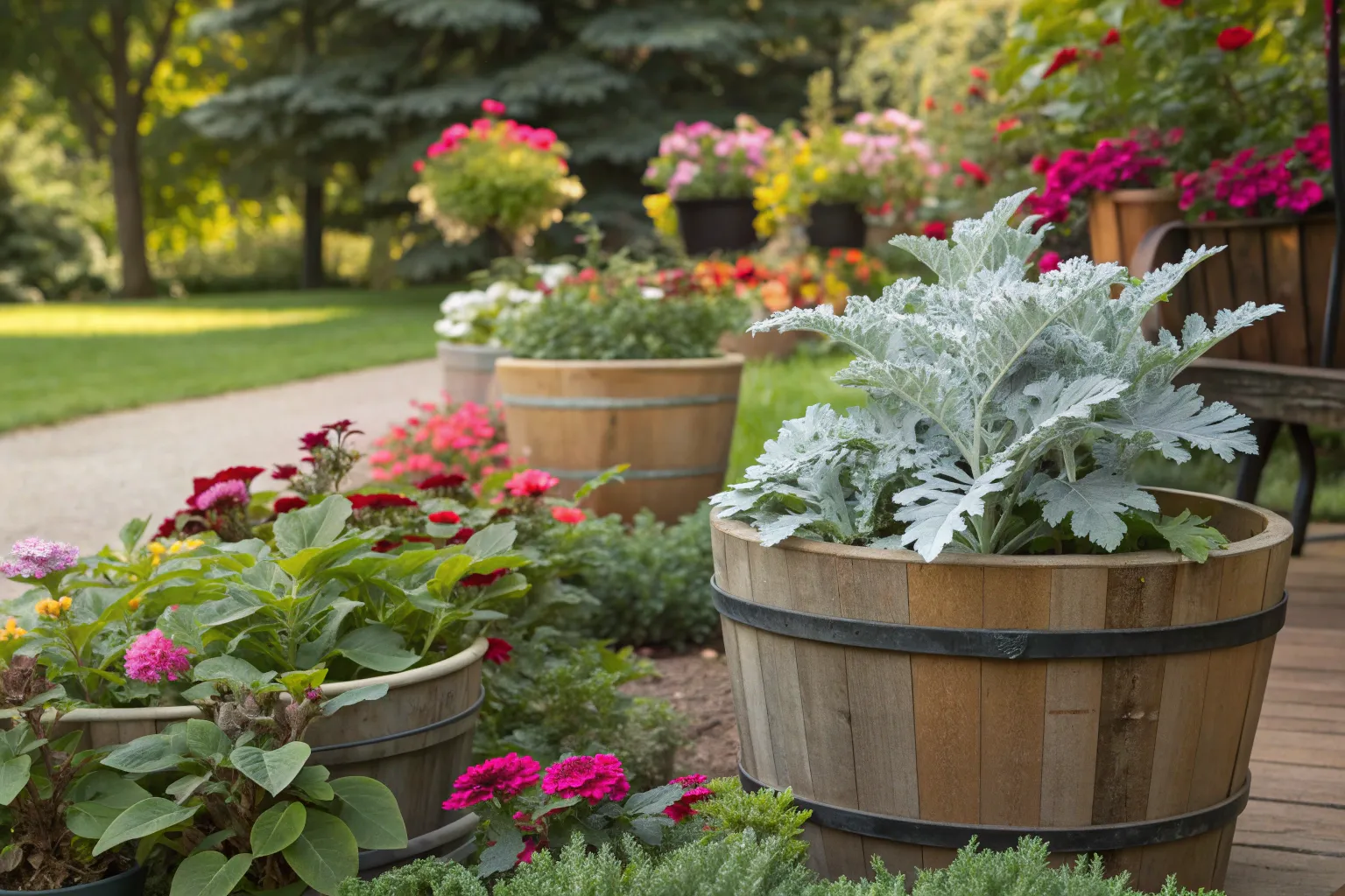 Use old wooden barrels as containers for dusty miller to add a rustic charm to your garden. This setup pairs well with country-style decor.