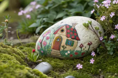 Paint a fairy house directly on a textured stone, using its natural shape to guide your design. I find that stones with unique textures add an authentic touch to any fairy garden.