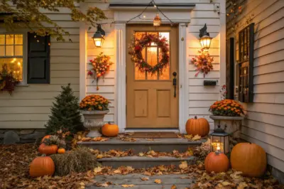 Frame your door with a garland of fall leaves to create a stunning focal point. It’s an easy DIY that transforms your entrance into a leafy autumn wonderland.