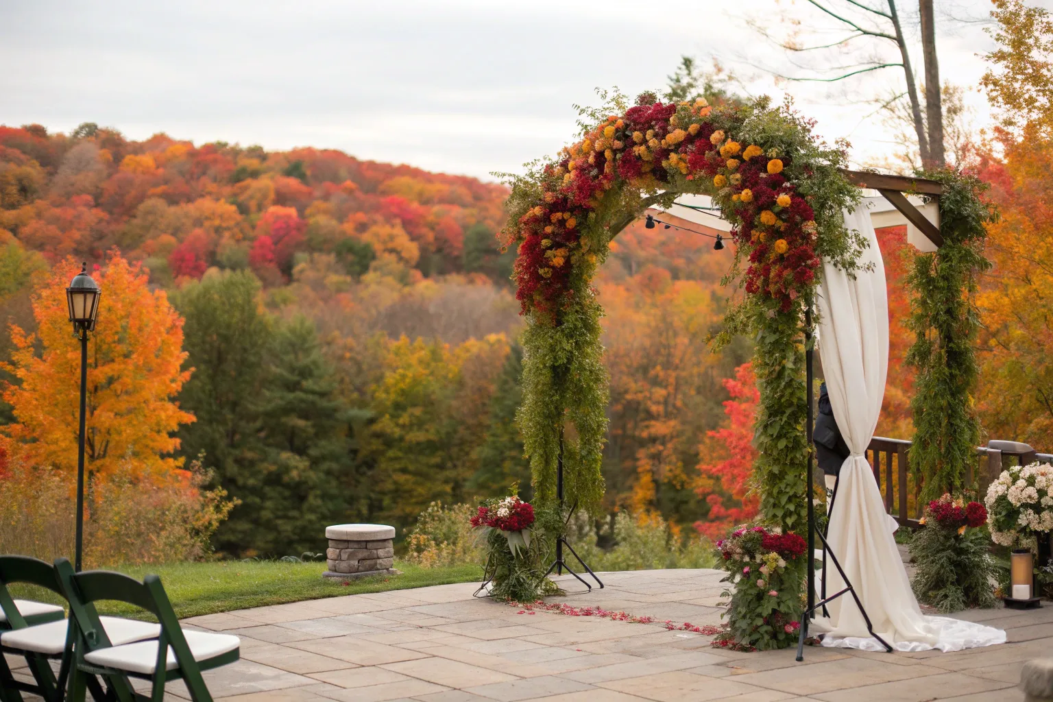 Think deep reds and oranges that mirror the turning leaves. These colors can really make your arch pop against a neutral backdrop.