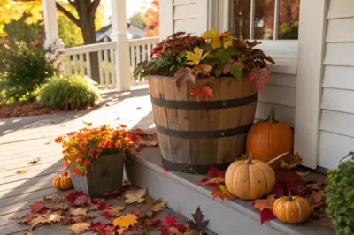 Place a small hay bale inside the whiskey barrel and top with fall decor like mini pumpkins or scarecrows. This adds a rustic touch that feels like a countryside retreat.