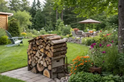 Blend your firewood stack into the landscape by nestling it among natural elements like stones or shrubs. It’s a subtle way to incorporate practicality into your garden’s aesthetic.