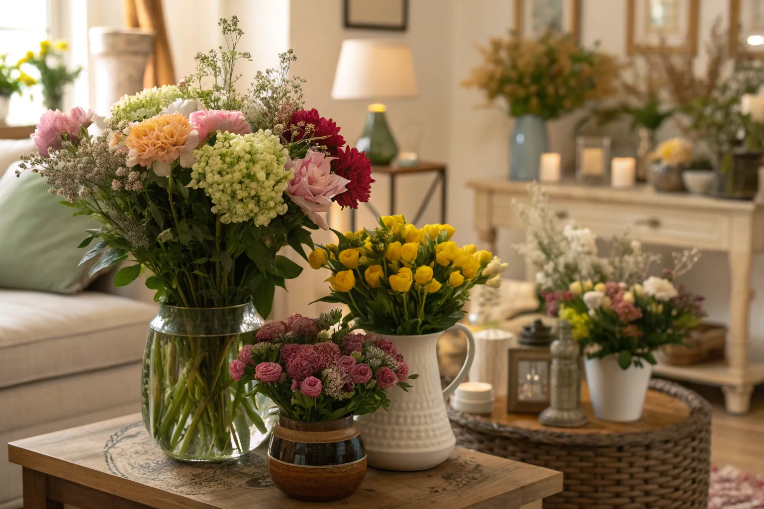 Your coffee table is a perfect spot for a low, wide flower arrangement. Mix garden roses with leafy stems for a relaxed yet stylish vibe that ties the room together.