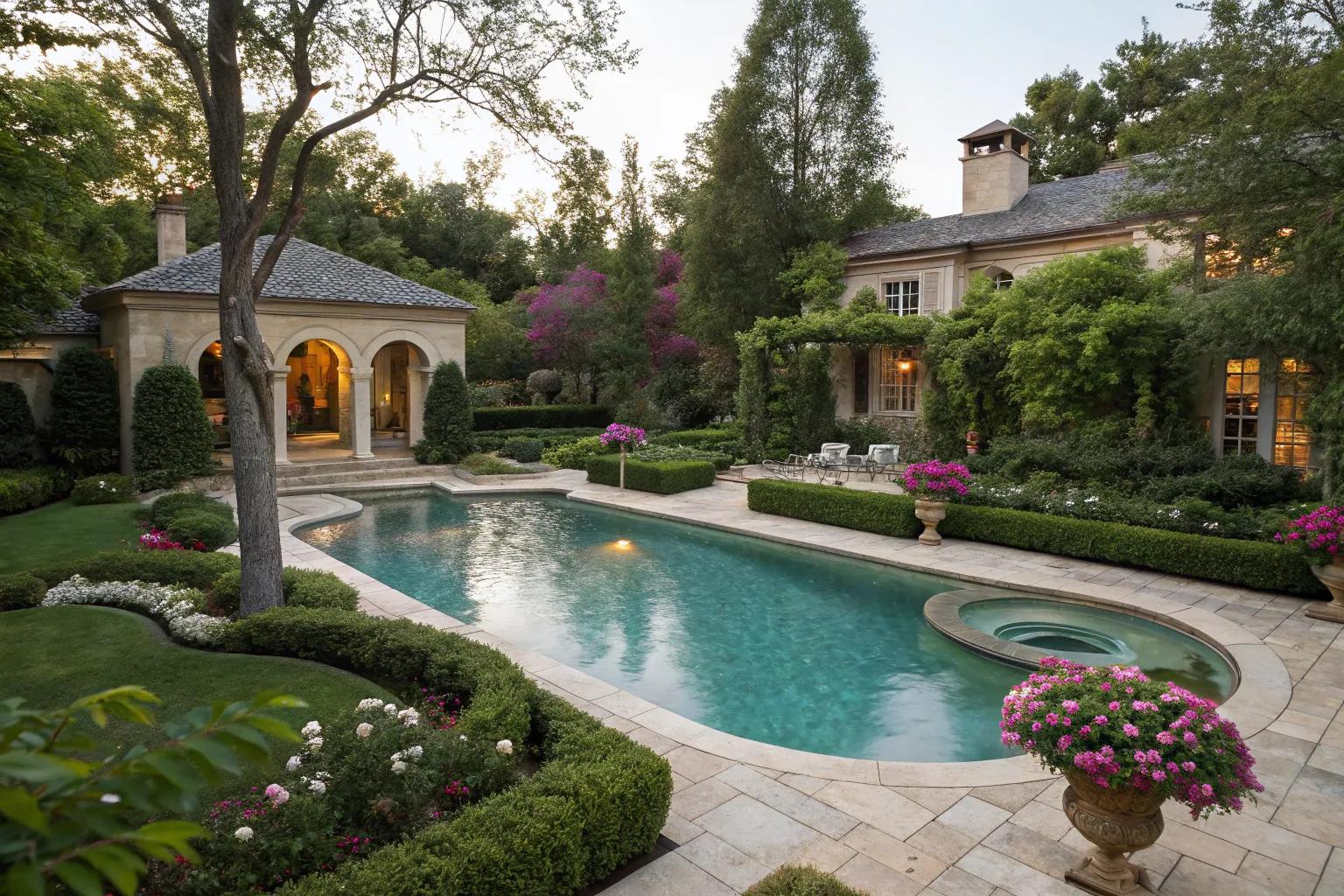 Surround your pool with flowering plants for a burst of color and fragrance. It’s a delightful way to enhance your outdoor space with natural beauty.