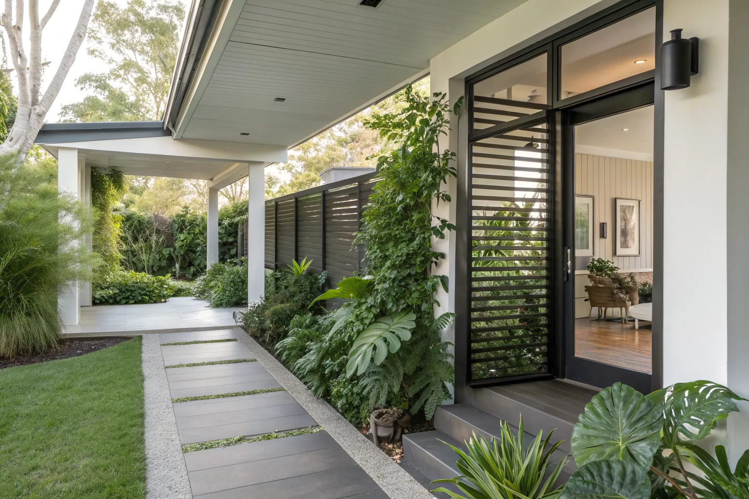 - Outdoor Slatted Privacy Screen: Enhance your entryway’s charm with this durable wood screen that offers privacy without blocking air.