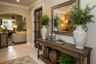 A large decorative mirror can work wonders by making your front entry feel bigger and brighter. I’ve seen it change a client’s dull entry into a lively, inviting space with just one addition.