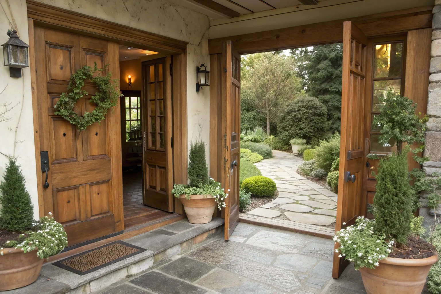 Nothing says ‘welcome’ like rustic wooden doors that highlight the natural grain and texture. I’ve seen these create an inviting atmosphere that instantly makes guests feel at home.