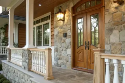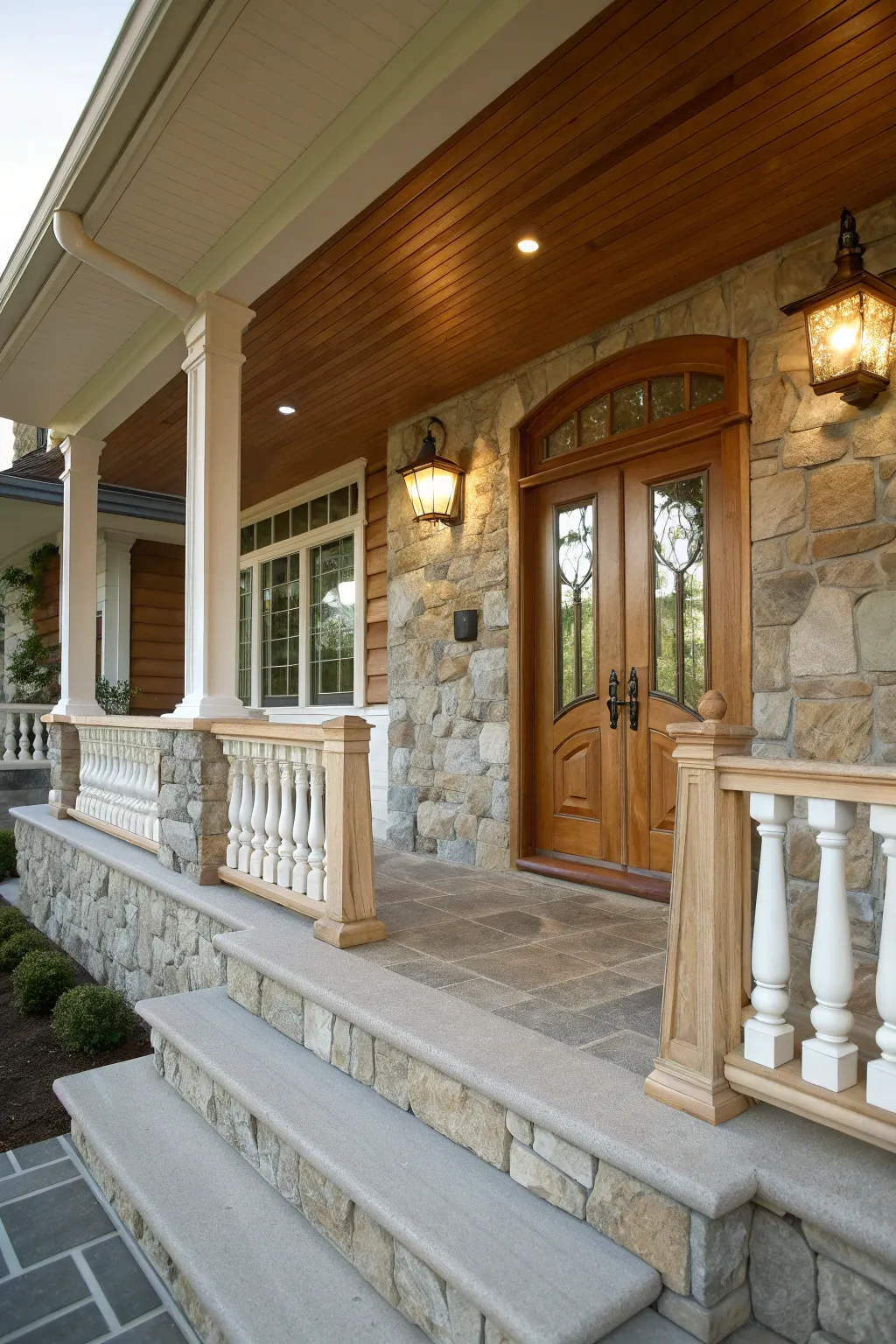 Blend stone and wood for a custom, high-end look. This combination adds depth and sophistication to your porch.